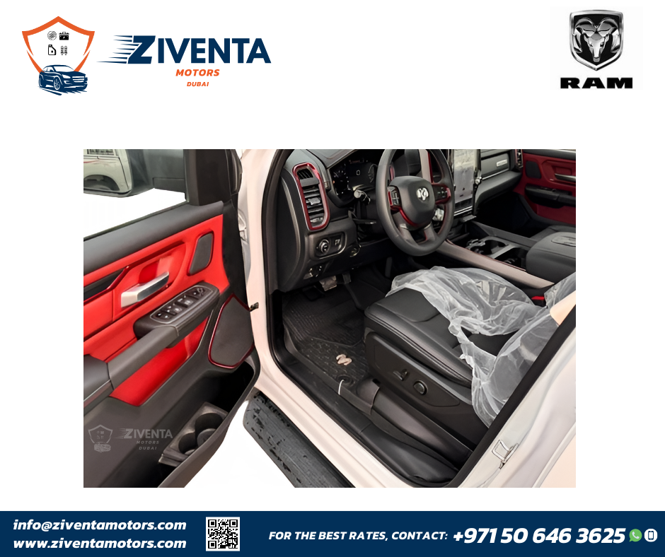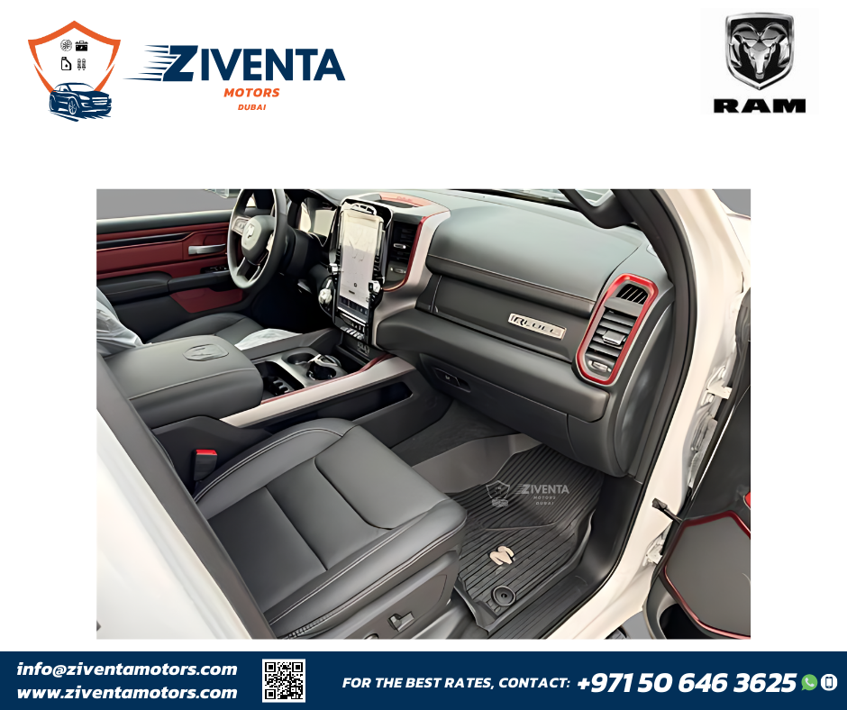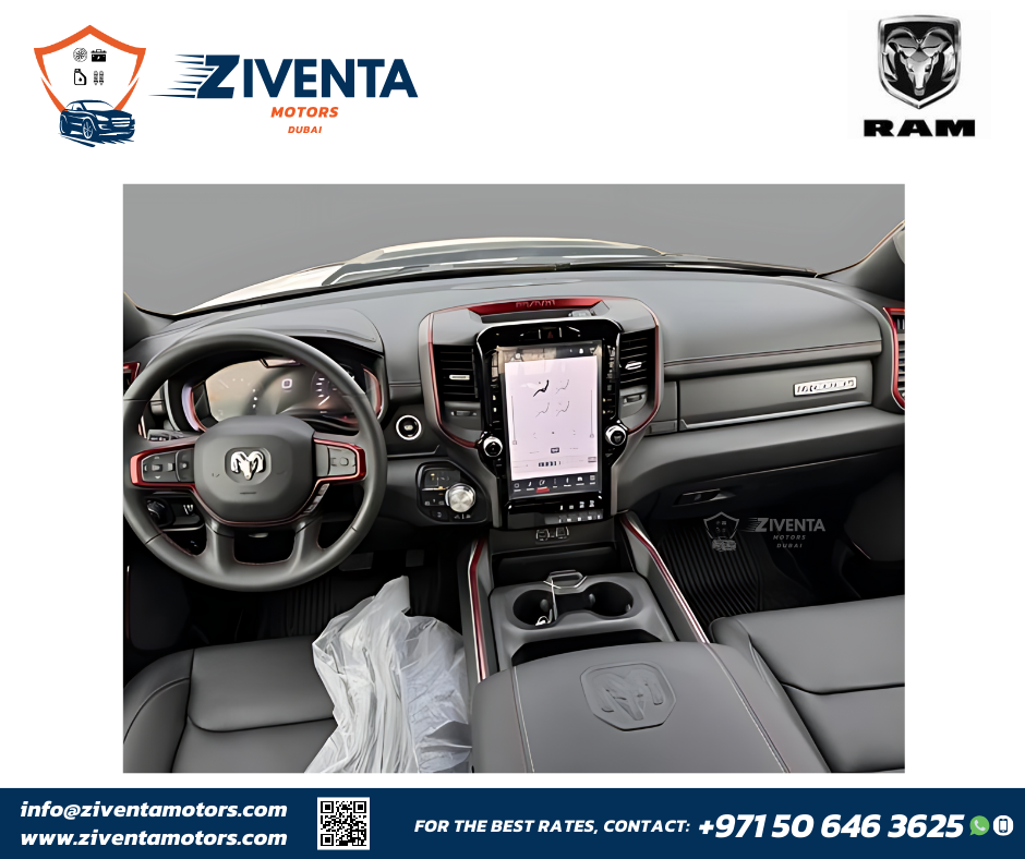 The Ram 1500 Rebel interior is highlighted by a leather-wrapped steering wheel with paddle shifters and a leather-wrapped center console-mounted shifter knob. Premium leather-trimmed vinyl bucket seats with red accent stitching add comfort to an intimidating ride. And let the fresh air in with a dual-pane panoramic sunroof.