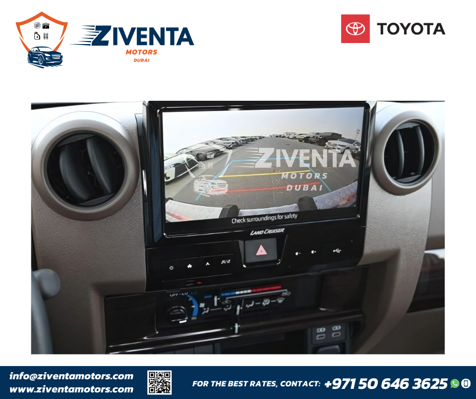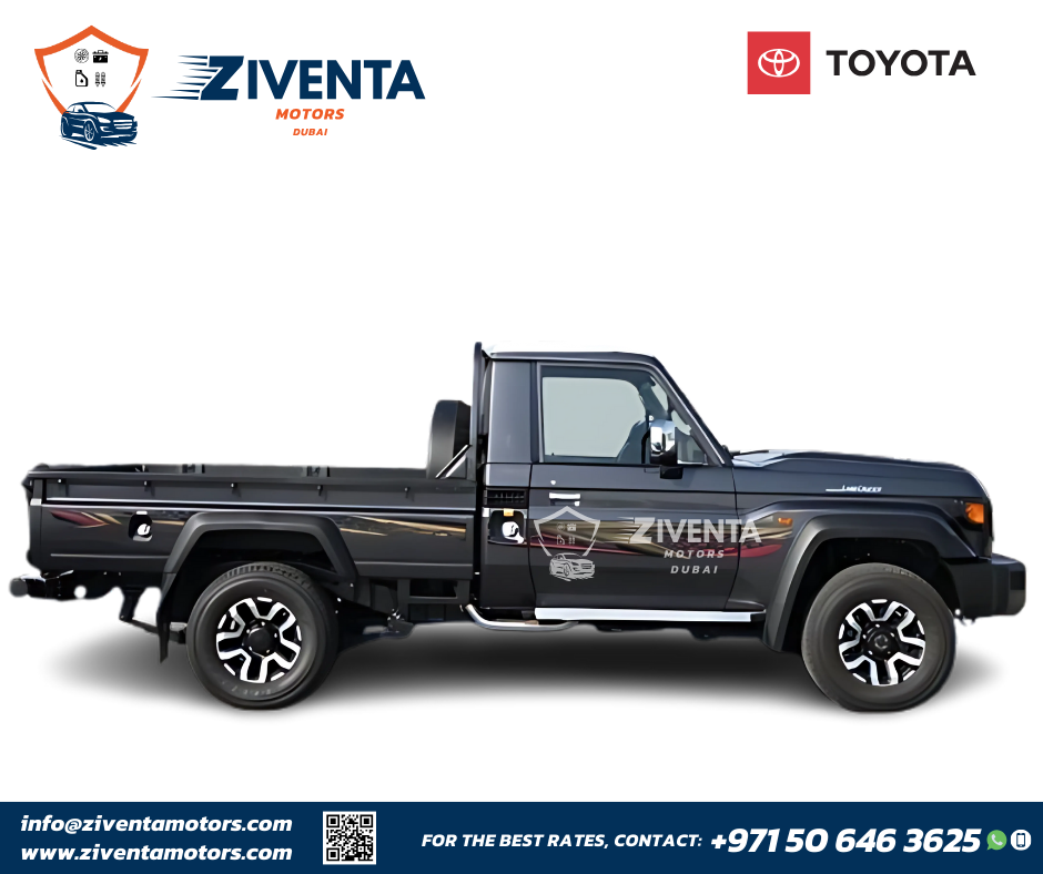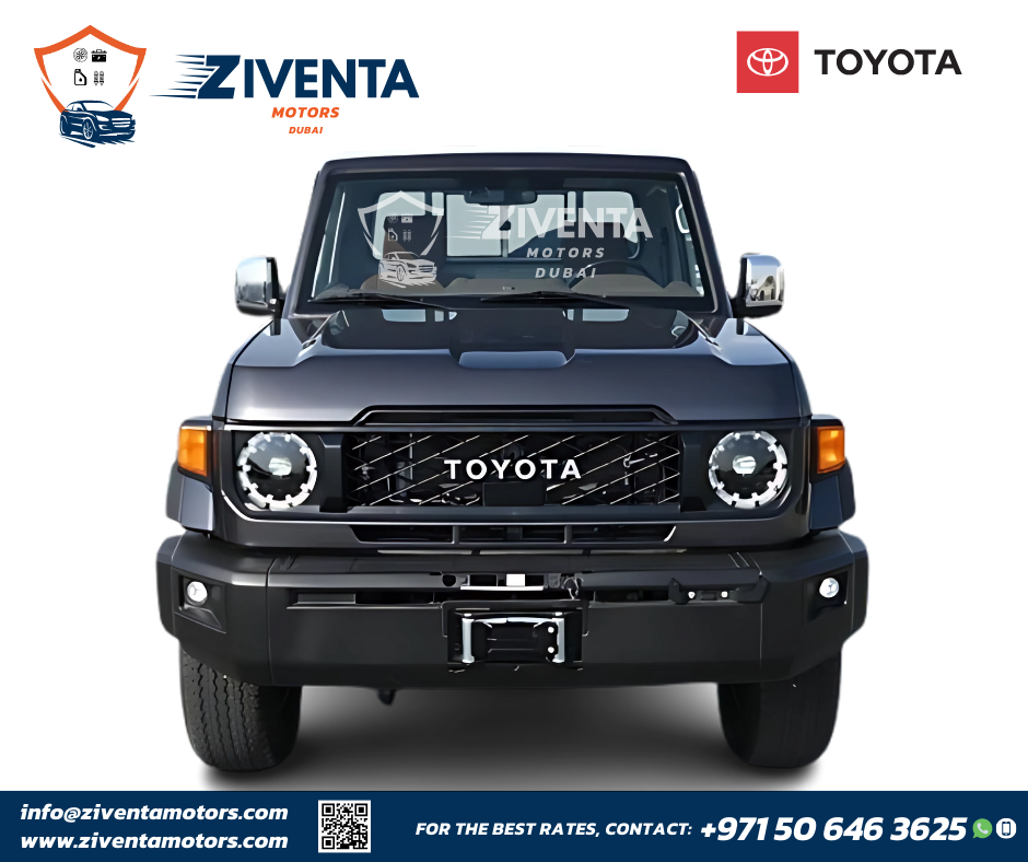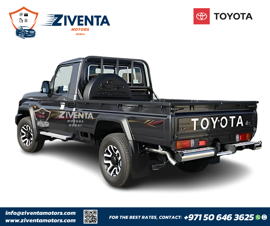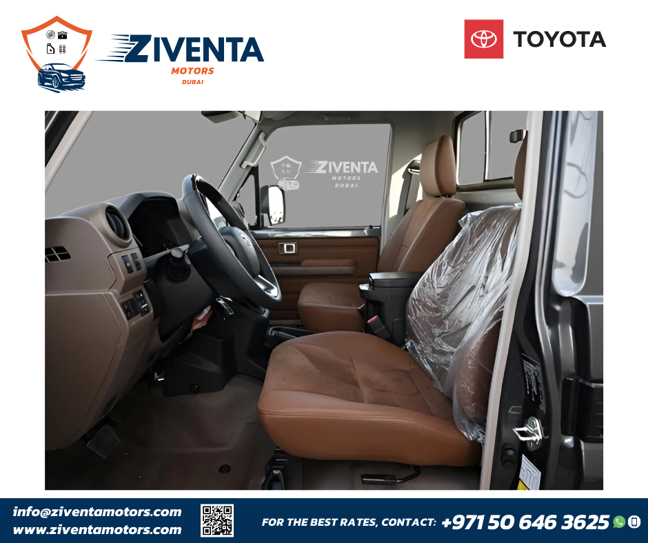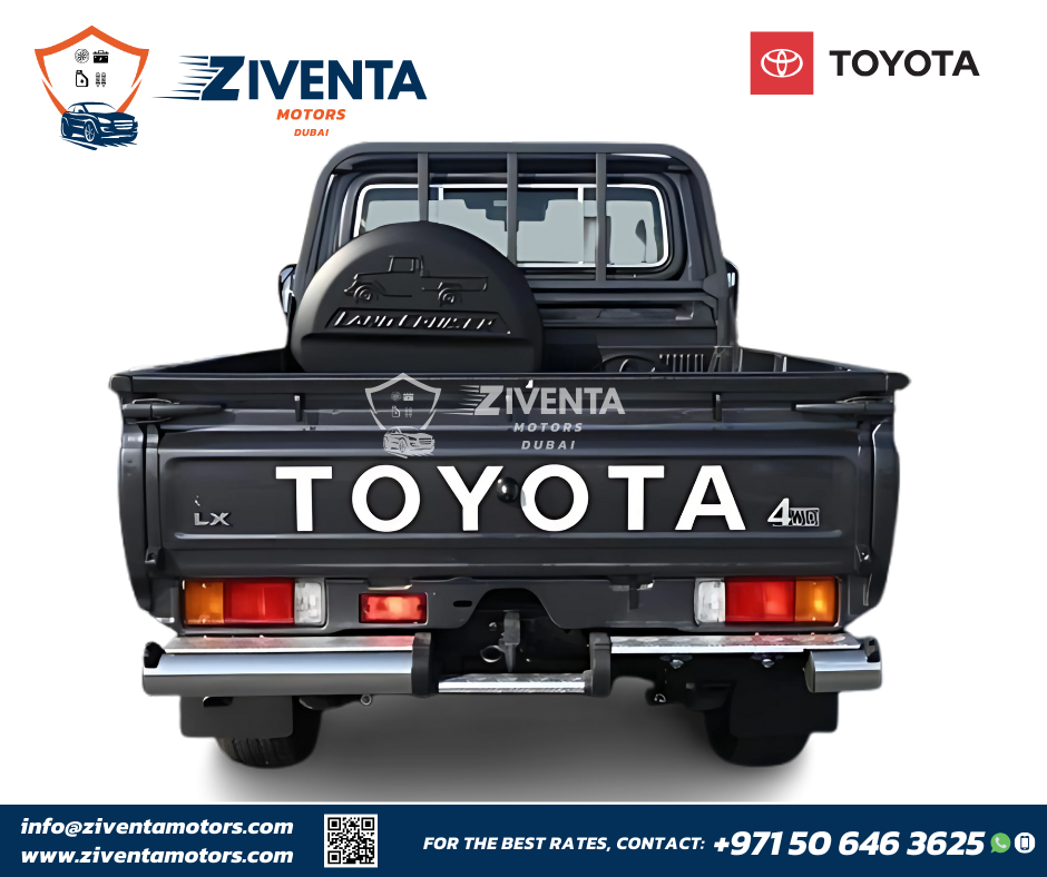 The Land Cruiser 79 double cab wears a bold, new front fascia with retro-inspired looks that hark back to the original model. Classic circular headlights and LED foglamps complement the new bonnet, front wheel arches, bumper and grille that proudly displays Toyota across it. Prominent side indicators complete the front redesign. The wheel surface coating has been changed to dark grey metallic paint, while the bumper and grille has been redesigned to feature a black finish – all reinforcing the sense of solidity on all models. The Land Cruiser 79 double cab looks as good as it performs.